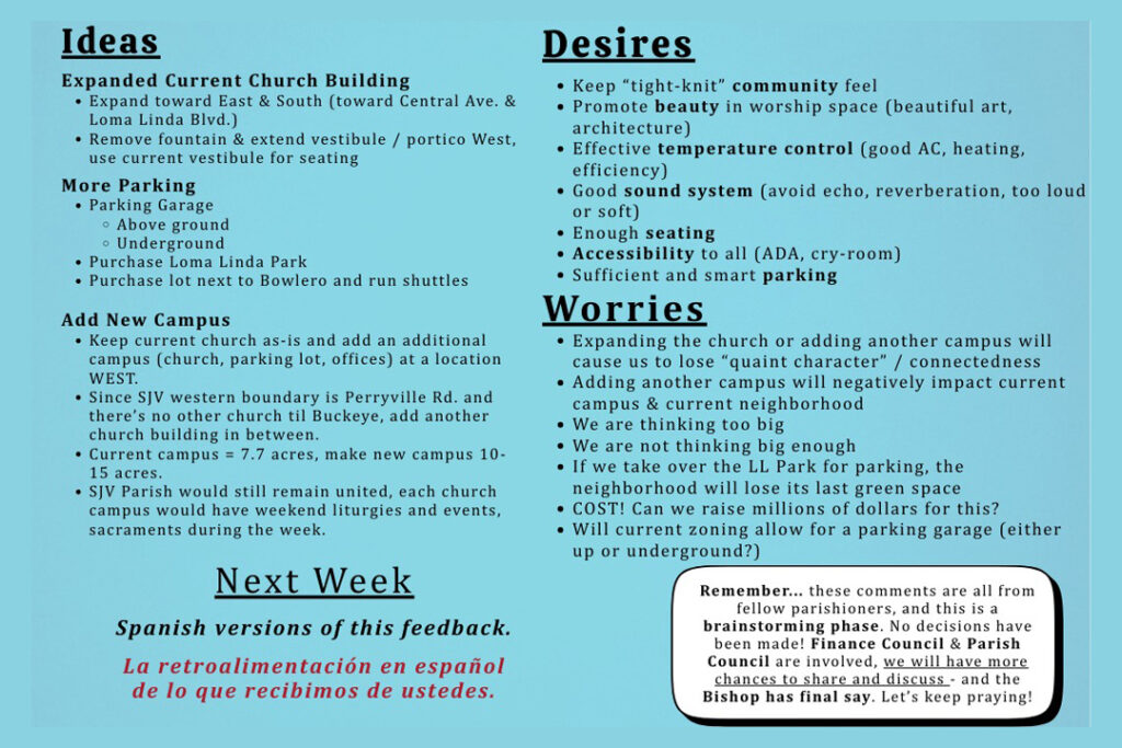 Remember… these comments are all from fellow parishioners, and this is a brainstorming phase. No decisions have been made! Finance Council & Parish Council are involved, we will have more chances to share and discuss – and the Bishop has final say. Let’s keep praying!